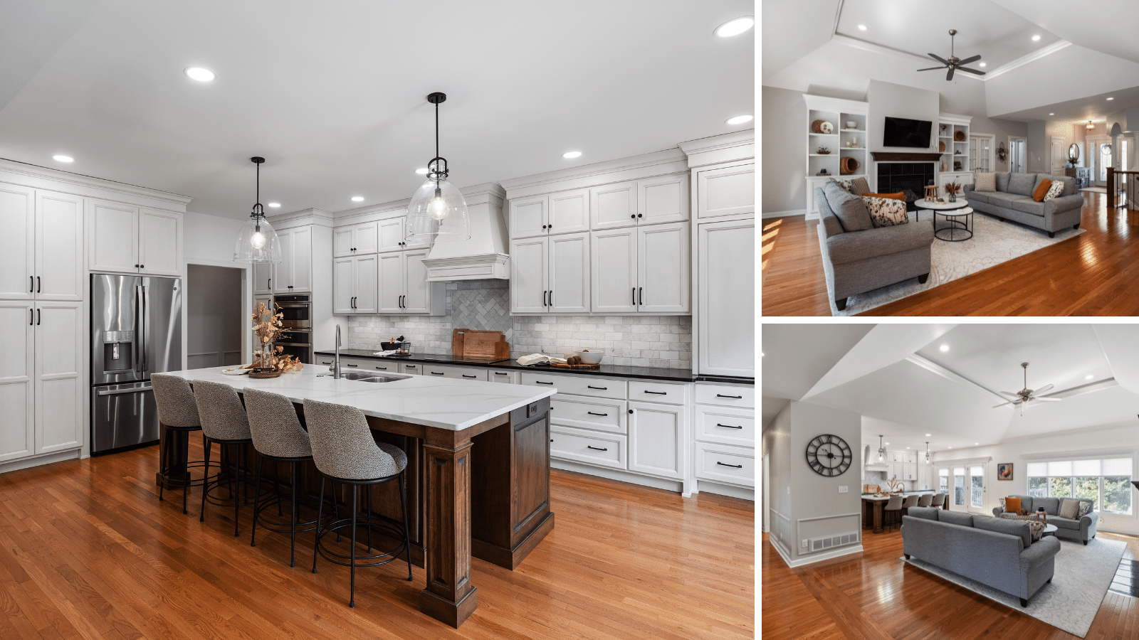 The finished space is bright, open, and elegantly designed — a perfect blend of timeless style and modern convenience. From the warm wood tones of the island to the crisp cabinetry and statement lighting, every detail reflects quality craftsmanship and thoughtful design.